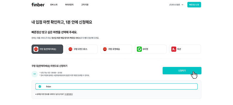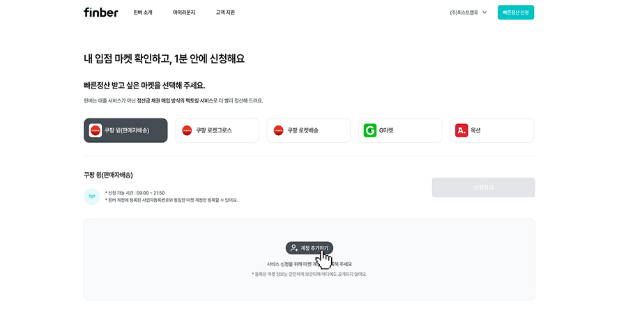 빠른정산 받고 싶은 마켓의 판매자센터 로그인 정보를 등록해 주세요. ※ 가입 시 인증한 사업자등록번호와 동일한 계정만 등록 가능해요.