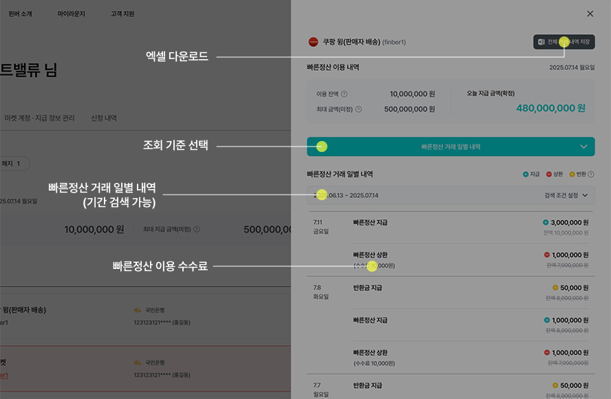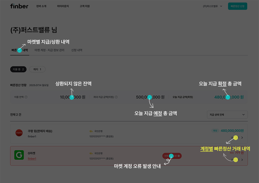 - 오늘 지급 확정 총 금액 : 오늘 지급이 확정된 빠른정산 총 금액이에요.